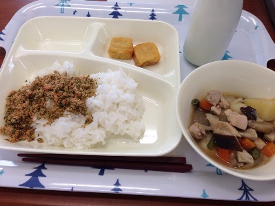 「鶏肉とじゃがいもの煮もの、あつあげのしょうゆだれかけ、紅ざけそぼろ、ごはん、牛乳」です。