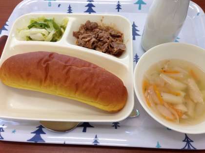「パンプキンパン」は、かぼちゃペーストが練りこまれていて、色がとてもきれいです。ふわふわでやわらかく、1年生にも食べやすかったようです。