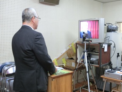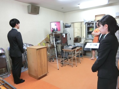 その後、教育実習生2人の紹介【写真中】とご挨拶があり、給食委員会の児童からは、野菜キャラクター募集の案内【写真右】がありました。