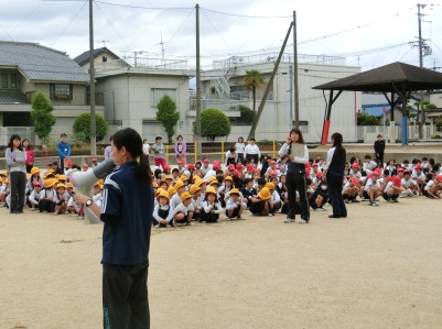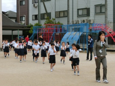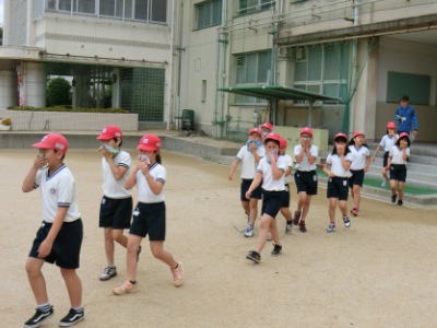 5月8日(火)10時5分、家庭科室からの出火・延焼中を想定した「避難訓練」を実施しました。児童は「火災が発生しました」の放送を聞いて、担任の先生に導かれ運動場へ避難しました。ハンカチを口にあてて、5分20秒で避難し、人数確認を行うことができました。