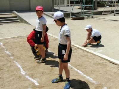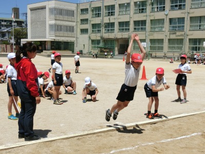 5月11日(金)3限、4年1組と3組は、運動場で「スポーツテスト」を実施しました。「立ち幅とび」【写真左・中】は、砂場の手前の踏切線から、助走なしでどのくらい跳べるか測りました。