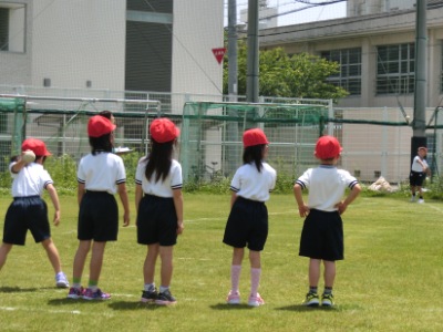 ソフトボール投げは、中心角30度の扇形の先から、ボールを投げ、何メートル投げられたかを測ります。1年生は、初めてにぎるソフトボールでしたが、全員が上手投げをしていました。今日の気温は30°Cを超え、とても暑かったですが、みんなよく頑張りました。スポーツテストの結果は、今後の体育の授業等に活かしていきます。