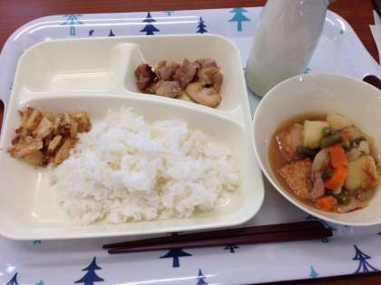 「鶏肉のてり焼き、じゃがいもとあつあげの煮もの、ごまかかいため、ごはん、牛乳」です。