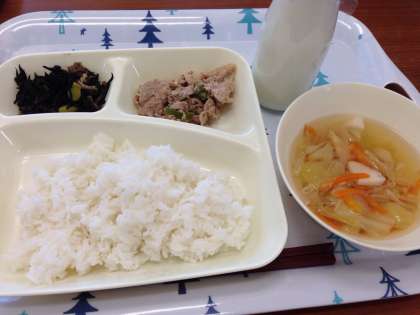 「豚肉のごまだれ焼き、五目汁、ひじきのいため煮、ごはん、牛乳」です。