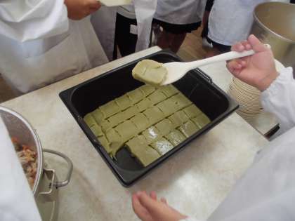「まっ茶ういろう」は、手作りのデザートです。上新粉、砂糖、抹茶、水、白いんげんのペーストを混ぜ合わせ、蒸して作ります。