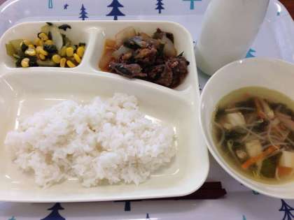 「プルコギ、とうふのスープ、チンゲンサイとコーンの甘酢あえ、ごはん、牛乳」です。