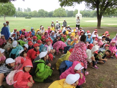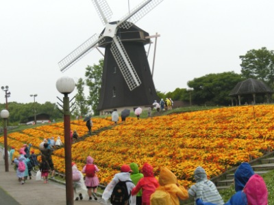 早速、噴水前【写真左】でクラスの集合写真を撮りました。雨がポツポツと降ってきたので、花博記念ホール前で、雨具を用意し、公園内を散策しました。風車の丘【写真中】からバラ園、日本庭園を通って、大芝生広場【写真右】へやってきました。