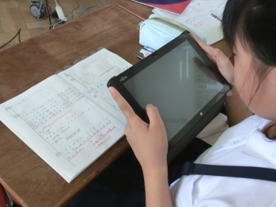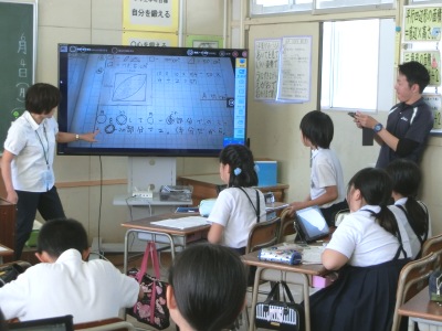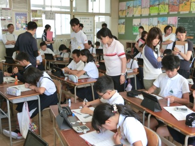 円を含む複合図形の面積の求め方を考え、図や式を使って発表をするという学習でした。児童はこれまでの学習を振り返り、面積の求め方を考えノートにまとめました。タブレットPCを使って、ノートを撮影し、大型ディスプレイに映し出し、自分の考えを発表【写真右】しました。子どもたちが、タブレットPCを自然に使いこなす姿がとても印象的でした。そして放課後に、全教員で研究討議会を行いました。