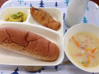 6月4日(月)のこんだては、「サーモンフライ、豆乳コーンスープ、キャベツのカレーソテー、ライ麦パン、牛乳」です。