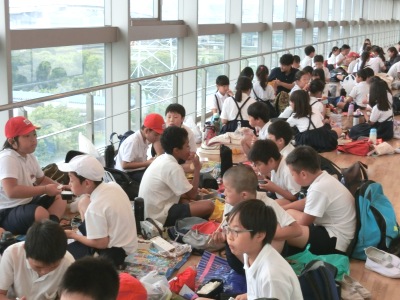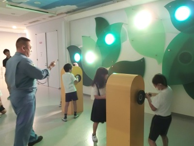 工場全体の状態を監視する中央制御室【写真左】やボイラ室、灰ピット、発電機などを見学しました。また、発電ゲーム【写真中】やクイズができるコーナーでは、楽しみながら焼却工場のことを学ぶことができました。見学後は廊下にシートを敷いて、お弁当をいただきました。職員の方々には、ごみ処理の工夫、環境保護などについて教えていただき、ごみ処理についての理解を深めることができました。