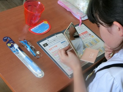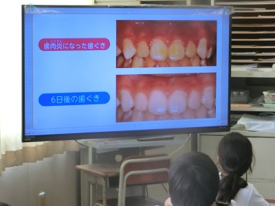小学生の34.5%が「歯肉炎」になっています。子どもたちはDVDを見ながら、歯の汚れの正体や歯ぐきのサイン、歯みがきの基本について学習しました。歯並びにあわせた歯のみがき方やデンタルフロスの使い方など、とてもよくわかりました。