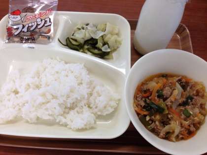 6月8日(金)のこんだては、「マーボーはるさめ、海そうサラダ、アーモンドフィッシュ、ごはん、牛乳」です。