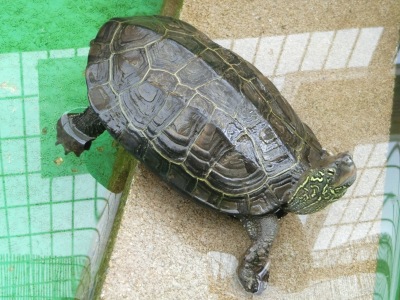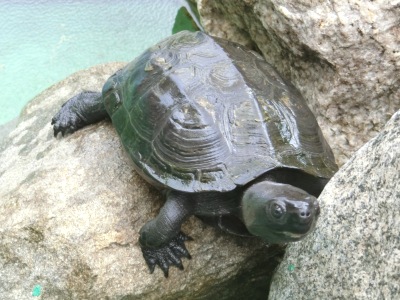 「長(なが)くん」【写真左】は、クサガメで、特徴は顔に緑の模様があります。特技は首をながーくのばせることです。「吉(よし)くん」【写真右】はイシガメ(たぶん)で、性格は小さくてもわんぱくです。どちらも性別は不明ですが、愛きょうがあり、みんなを和ませてくれています。