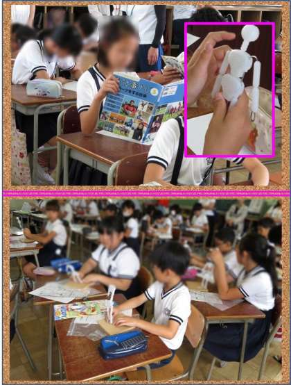 1時間目は、図工で「12年後のわたし。ぼく」という学習でした。二十歳を過ぎて大学も卒業するころになって、どんな仕事に就きたいのかを想像して、働いている自分を粘土で表現します。今日は、その構想を考えたり、芯材を使ってどんなポーズにするのか考えていました。スポーツ選手やパティシエ、幼稚園の先生やお母さん、ユーチューバーなどたくさんの仕事を夢見ながら活動していました。