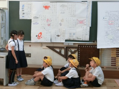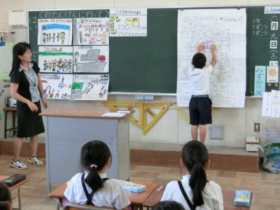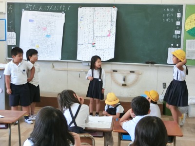 2年生の1限は、生活科の「町たんけんに行って」の学習でした。5月に町たんけんで行ったスーパーや魚屋、消防署、神社などの様子について、班で調べた内容の発表や当日の様子を再現していました。