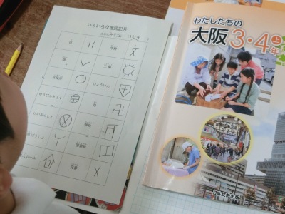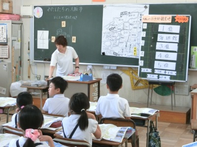3年生の1限は、社会科の「わたしたちの大阪市」の学習でした。1組は「大阪おすすめ観光地ベスト10」について考えて、発表していました。2組は「いろいろな地図記号」について学習しました。