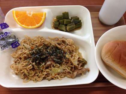 「焼きそば、オクラの中華あえ、オレンジ、1/2黒糖パン、牛乳」です。