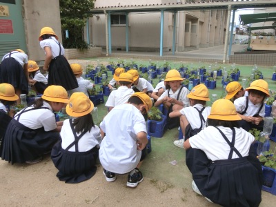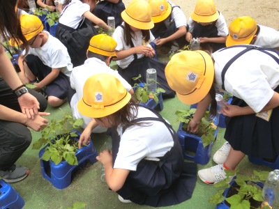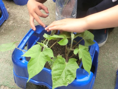 6月14日(木)5限、1年3組の児童は、5月17日に種をまき、毎日水やりをした自分たちの「あさがお」に化成肥料をあげました。