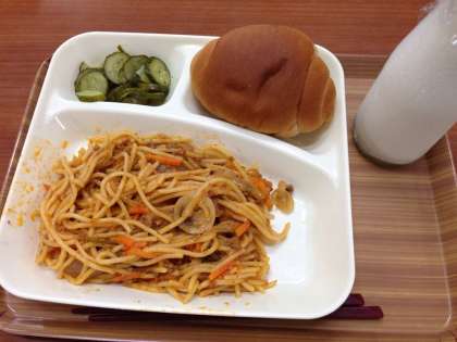 6月15日(金)のこんだては、「スパゲッティミートソース、きゅうりのバジル風味サラダ、1/2黒糖パン、牛乳」です。