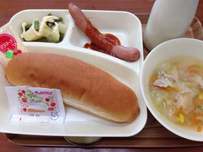 6月26日(火)のこんだては、「ウインナーのケチャップソース、野菜スープ、じゃがいもと三度豆のサラダ、コッペパン、りんごジャム、牛乳」です。