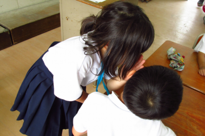先生から聞いたお話を友達に伝えます。聞いたお友達は、その通りに絵に色をぬります。うまく伝わったかな?