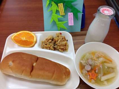 7月6日(金)のこんだては、「パエリア、ウインナーとキャベツのスープ、オレンジ、おさつパン、牛乳」です。