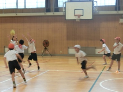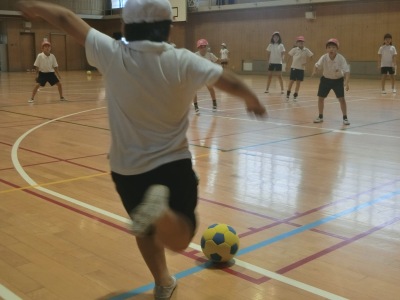7月6日(金)3限、4年1組は体育館で「三角キックベースボール」の練習を行いました。今度の学年集会で、クラス対抗の大会を行います。