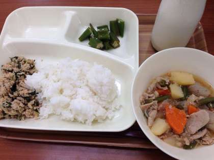 7月11日(水)のこんだては、「豚肉とじゃがいもの煮もの、オクラの梅風味、ツナっ葉いため、ごはん、牛乳」です。