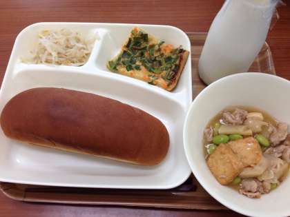 7月17日(金)のこんだては、「豚肉と野菜の煮もの、チヂミ、もやしの甘酢あえ、黒糖パン、牛乳」です。