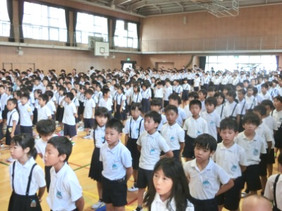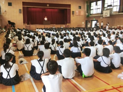 7月20日(金)、全校児童534名が体育館に集合し、「1学期終業式」を行いました。校歌斉唱【写真左】の後、校長先生から1学期の通知表所見の頑張ったことやできるようになったこと、みんなのために行動したことの紹介がありました。そして、夏休みには「家の手伝いをしよう」というお話がありました。その後、担当の先生から夏休みのくらしやプール開放について、お話がありました。