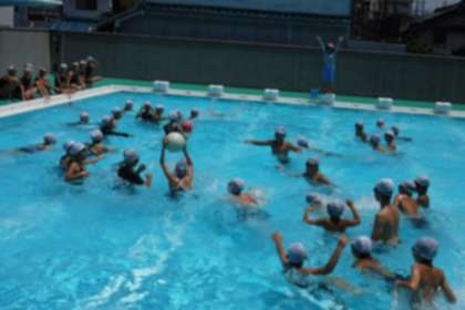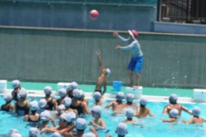 終わった後は、水中ポートボール大会をしました。プールサイドにいる先生のゴールを目指して、男子対女子で対戦します。泳いだり走ったりしてボールを追いかける作戦や少し離れてパスをしていく作戦がありました。延長戦の結果、女子チームが勝ちました。