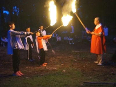 はじめにギターの伴奏にあわせて「遠き山に日は落ちて」を歌い、火の神が表れて、4人の子どもに聖なる火が授けられました。知恵の子には自由の火を、正義の子には勇気の火を、情熱の子には友情の火を、希望の子には愛の火が授けられ、一斉に点火しました。その後、「燃えろよ燃えろ」を歌って、楽しいゲームを行いました。