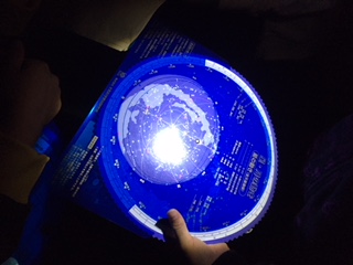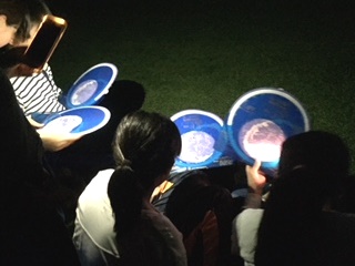 キャンプファイヤーの後、芝生グランドに移動して、「スターウォッチング」を行いました。芝生グランドに寝転んで月や夏の大三角形を観察することができました。「星座盤」を使って、先生に解説をしてもらって学習しました。