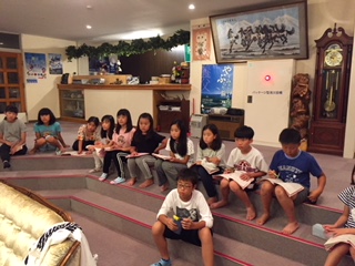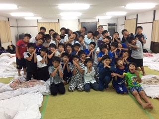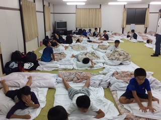 22時、就寝前の男子大部屋で集合写真【写真右】を撮りました。みんな、おやすみのポーズです。この後、静かに眠ってくれました。