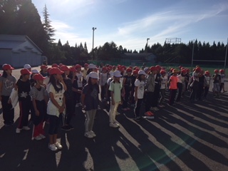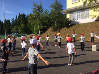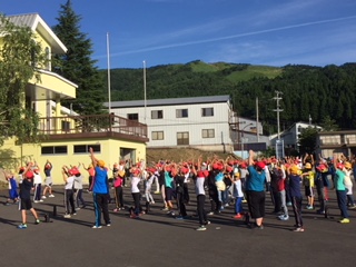 2日目の起床は6時30分でした。洗面の後、7時から宿舎前の広場で「朝の集い」を行いました。体調を崩す児童もなく、元気に2日目の朝を迎えました。