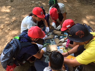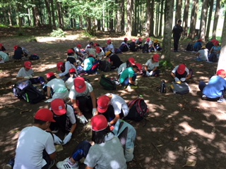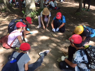 高原散策が終わって、9時から宿舎の裏山で「箸作り」に挑戦しまさした。あらかじめ割られた竹を小刀で箸の形に削っていきました。先の尖ったものや菜箸のようになっているものなど、自分だけのオリジナルの竹箸ができました。今日の夕食で初めて使う予定です。