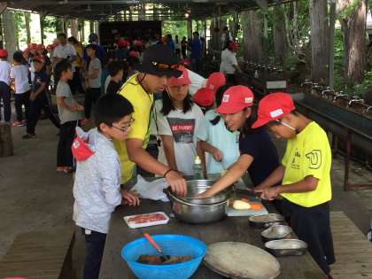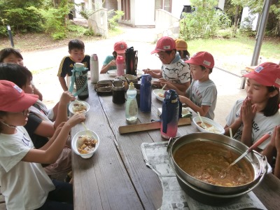 11時、宿舎裏の野外炊飯場に集合して、「カレー作り」を行いました。初めてカマドで火を起こして、飯盒でご飯を炊きました。