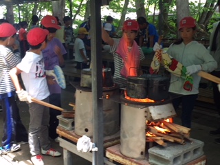 自分たちで作ったカレールウの味は、最高だったようで、食べ残した班はありませんでした。校長先生は、すべての班のカレールウを味見しましたが、甘味や辛さ、とろみが微妙に違っているのには驚きました。最後は自分たちが使った鍋や飯盒などをきれいに洗ったり、カマドを掃除したりして、13時過ぎに片づけが終わりました。