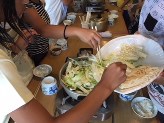 18時、林間学習2日目の夕食は、但馬地方の名物料理「かも鍋」です。予めかも肉と豆腐は煮込んでくれていますので、いただきますの後、野菜をいれて沸騰したらすぐにいただきました。