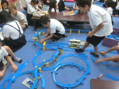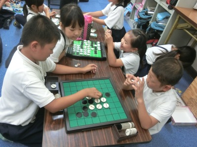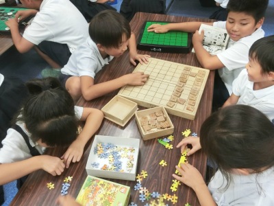 東校舎に移転した「いきいきB教室」では、オセロや将棋、ブロック、パズルなど、いろいろな遊びをしていました。床は新しくタイルカーペットが施工され、活動しやすくなりました。今日は教室や体育館など、屋内で活動しています。