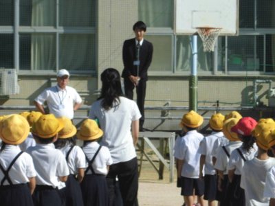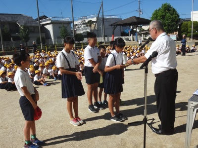 9月3日(月)始業前、児童朝会では、教育実習生の紹介【写真左】の後、書道やバドミントン、ミニバスケットの賞状伝達がありました。
