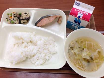 9月10日(月)の給食は、「さけのしょうゆ風味焼き、五目汁、高野どうふのいり煮、ごはん、牛乳」です。