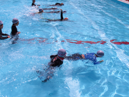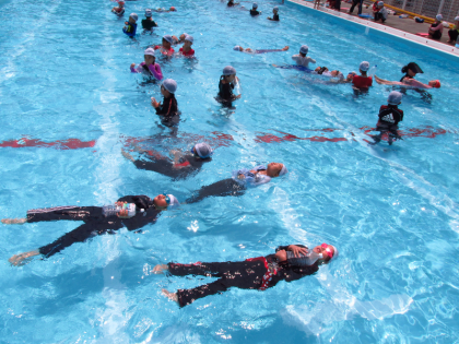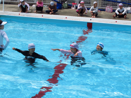 プール水泳の学習で、2年生から6年生まで着衣泳を体験しました。服を着たまま水の中を歩いてみたり、泳いでみたりしました。ペットボトルがあれば体を浮かせることもできることを体験しました。