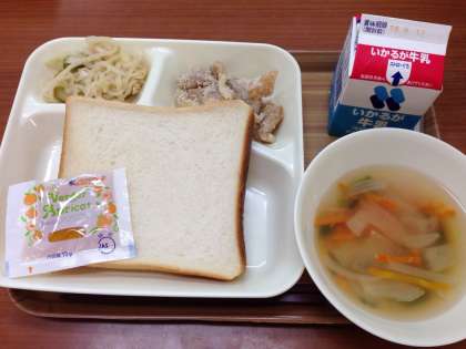 9月6日(木)の給食は、「鶏肉のからあげ、とうがんの中華スープ、切り干しだいこんの辛みづけ、食パン、アプリコットジャム、牛乳」です。