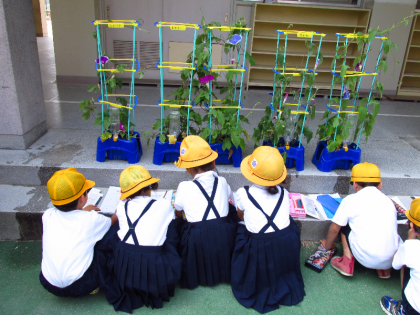 毎日、水やりをしてきたあさがおの花が咲き始めました。つぼみの様子や花の模様などを観察して絵や文でまとめました。