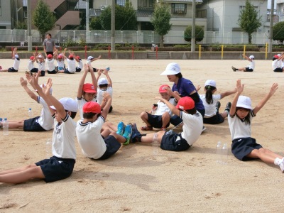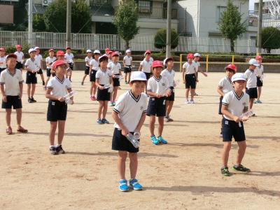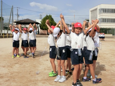 9月11日(火)1限、3年生は運動場で、運動会の「団体演技」の練習をしました。人気アニメ「名探偵コナン」のオープニング曲にあわせて、ペットボトル2本を持って踊っていました。