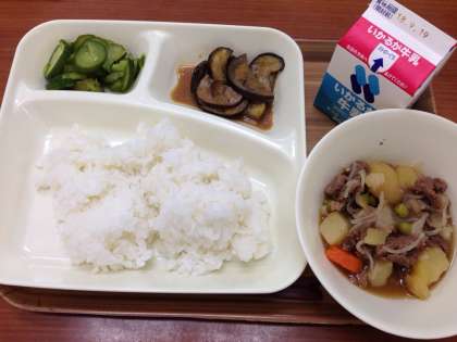 9月13日(木)のこんだては、「肉じゃが、焼きなすのみそだれかけ、あっさりきゅうり、ごはん、牛乳」です。