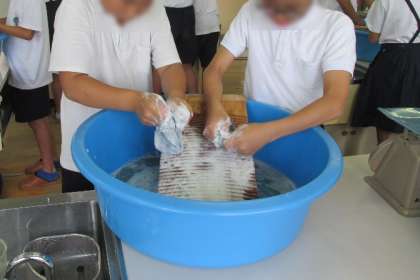 家庭科の学習で「洗濯実習」をしました。学校に履いてきた自分の靴下を、「洗濯板」を使って手洗いしました。洗濯板は、家にあって使ったことがある児童もいましたが、ほとんどの児童は初めて使いました。