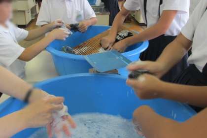 手洗いは洗濯機と違って大変ですが、どこに汚れがあるかを確認しながら汚れを重点的にもみ洗いすることができます。また、洗濯板を使うと手洗いだけよりも汚れがよく落ちるので驚いていました。