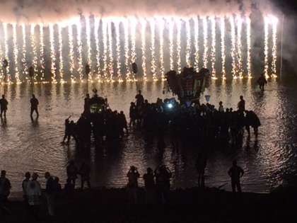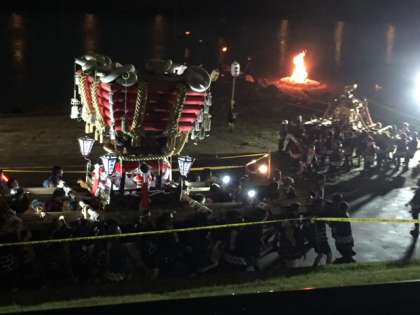 9月15日(土)、今日は「川辺八幡神社秋祭り」が開催されました。小雨まじりの中、19時から神輿とふとん太鼓が大和川にはいって「足洗い神事」が執り行われました。
